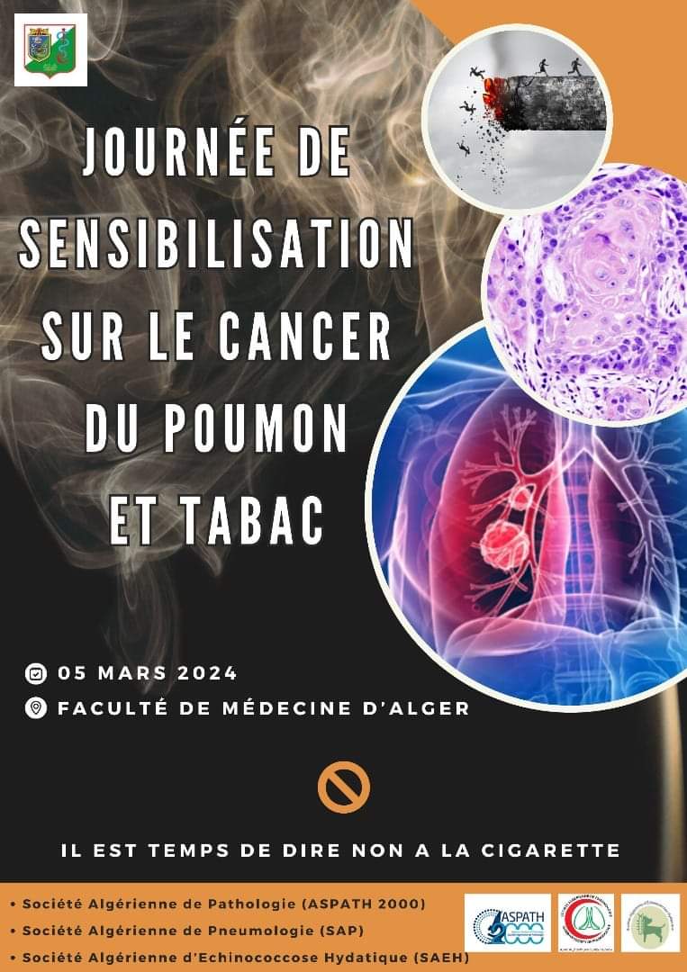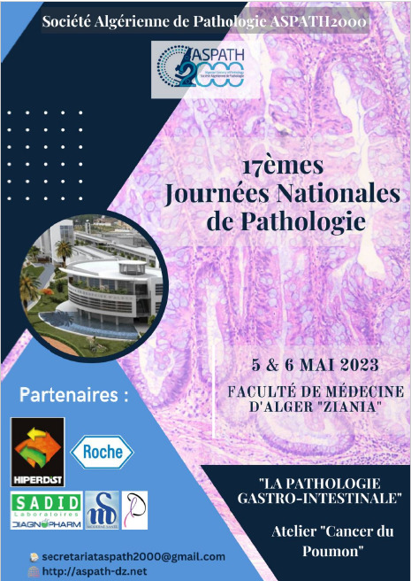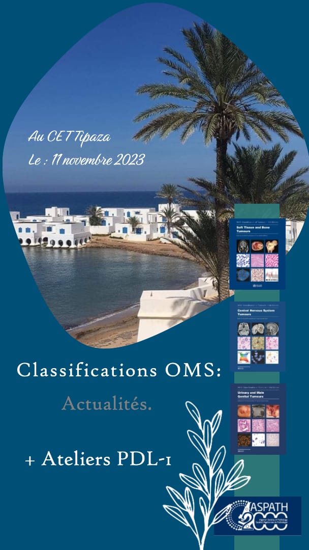J’ai l’honneur et le plaisir de vous informer que la Société Algérienne de Pathologie ASPATH 2000, et conformément à ses objectifs de formation continue, organise sa 2 ème journée régionale qui se déroulera le 11 Novembre 2023 au complexe touristique CET de Tipaza ; Le programme de cette journée est riche et varié, et aura pour thème principal « les actualités des classifications OMS » qui seront abordées par plusieurs pathologistes nationaux, chacun dans son domaine d’expertise. Ainsi, il y aura 7 présentations qui porteront sur la dernière classification OMS des tumeurs (5ème édition ) publiée entre 2020 et 2023 : Tumeurs cutanées, des tissus mous, des tumeurs oculaires, des organes endocrines et des tumeurs Neuroendocrines, des tumeurs du système hématopoïétique , des tumeurs urologiques et en dernier, les tumeurs nerveuses. Ces présentations seront suivies par 3 ateliers consacrés à un thème d’actualité en pathologie, qui est l’interprétation du PDL1, dont le rôle en immunothérapie et dans la médecine de précision est bien démontré. Des communications affichées sous forme de e-posters portant sur diverses pathologies seront également présentées.
