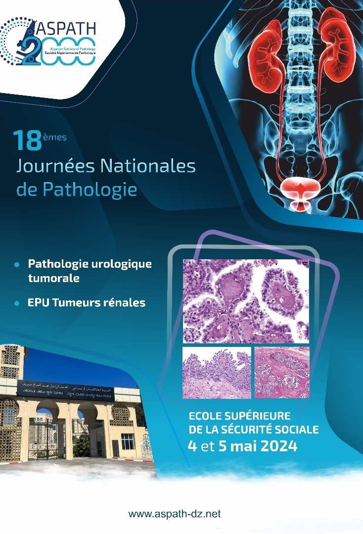 Le bureau de la Société Algérienne de Pathologie (ASPATH 2000) a le plaisir de vous informer que suite au sondage réalisé lors des 17èmes Journées de l’ASPATH, tenues les 5 & 6 mai 2023, et tenant compte des propositions de la majorité des pathologistes, les 18èmes Journées Nationales se tiendront les 4 & 5 mai 2024 à l’ESSS (Ecole Supérieure de la Sécurité Sociale), ayant comme thème principal la pathologie urologique tumorale avec un EPU sur les tumeurs rénales. (Programme ci-dessous)